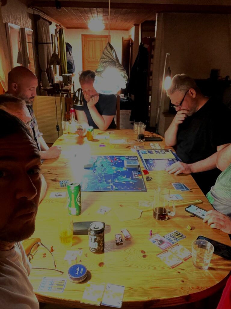 Här fann vi tillbaka till varandra. Spelen blev allvarligare, strategierna hårdare – men så också gemenskapen. De långa nätterna fylldes inte bara av planer och skratt, utan även av god mat, starka drycker och en skvätt alkoholromantik. Flaskor öppnades som förseglade hemligheter, glas höjdes som om de bar på urgamla löften, och ruset blev ännu en del av banden mellan oss.